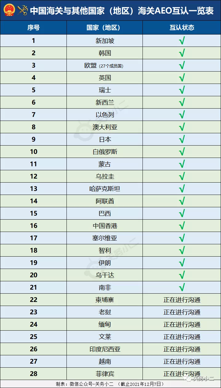 ? ? ? ? 截至2021年12月7日,中國已經(jīng)與新加坡、韓國和南非等21個經(jīng)濟體47個國家(地區(qū))簽署了海關AEO互認安排。中國AEO企業(yè)對AEO互認國家(地區(qū))進出口額約占進出口總額的60%。