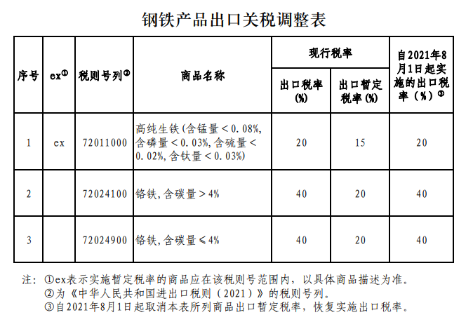 In order to promote the transformation and upgrading and high-quality development of the steel industry, with the approval of the State Council, the Customs Tariff Commission of the State Council issued an announcement that starting from August 1, 2021, the export tariffs of ferrochrome and high-purity pig iron will be appropriately increased, and 40% and 40% will be implemented after adjustments. The export tax rate of 20% is shown in the figure below.