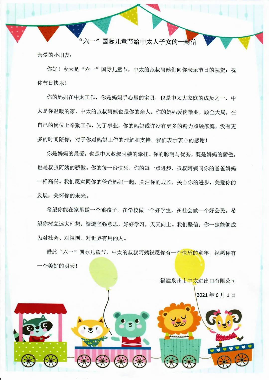 In addition to congratulating the children on the holiday, the content of the letter also thanked the children for their support and understanding of their parents’ work. We wish the children a happy childhood, and we are willing to work with the parents of the children to pay attention to their growth, their progress, their development, and their future. We also firmly believe that they will be able to become useful to society, to the motherland, and to the world in the future. At the same time, we also gave small holiday gifts to the “big friends” of the company. We are all members of the big family of Zhongtai, and we are all “children” of Zhongtai. I hope that on this Zhongtai platform, everyone can be like “children”, maintain innocence, maintain an enterprising attitude, grow together, and become the one who makes themselves and their children proud.
