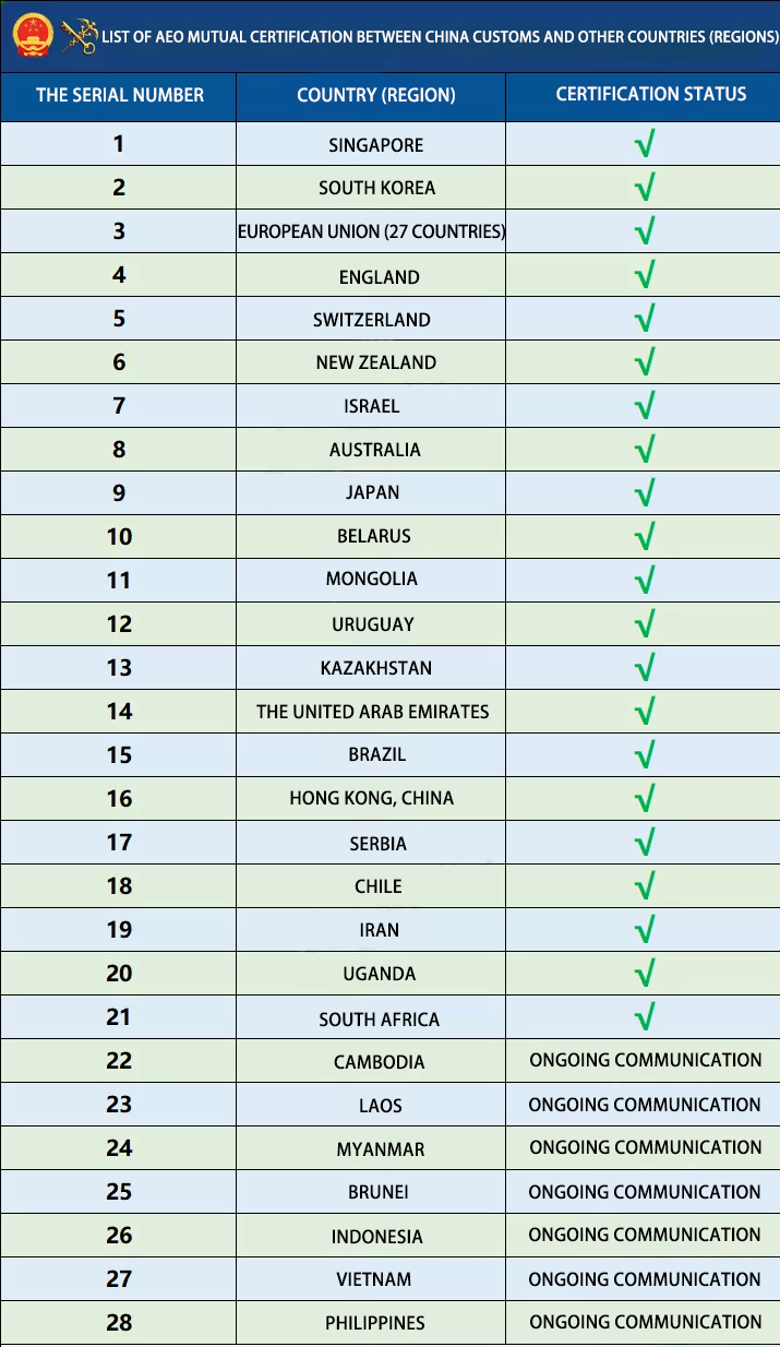 Implementation of AEO Mutual Recognition between China and South Africa Customs (with a list of AEO Mutual Recognition)