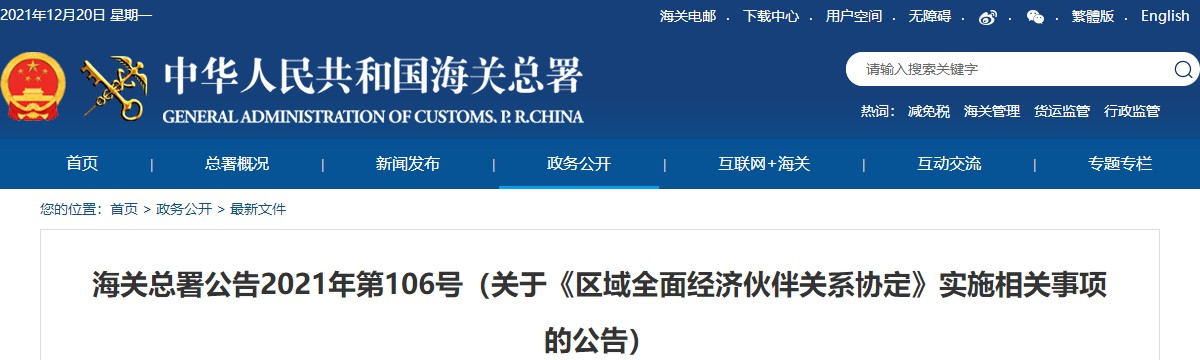 Announcement No. 106, 2021 of the General Administration of Customs (Announcement concerning the Implementation of the Regional Comprehensive Economic Partnership Agreement)